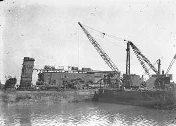 Salvage work on the scuttled German High Seas Fleet in Scapa Flow, date unknown. The floating dock used by Cox & Danks Ltd. is shown raising another german ship from the seabed.