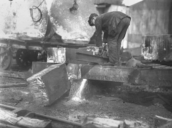 A salvage worker cutting armour plating on one of the German ships, date unknown.