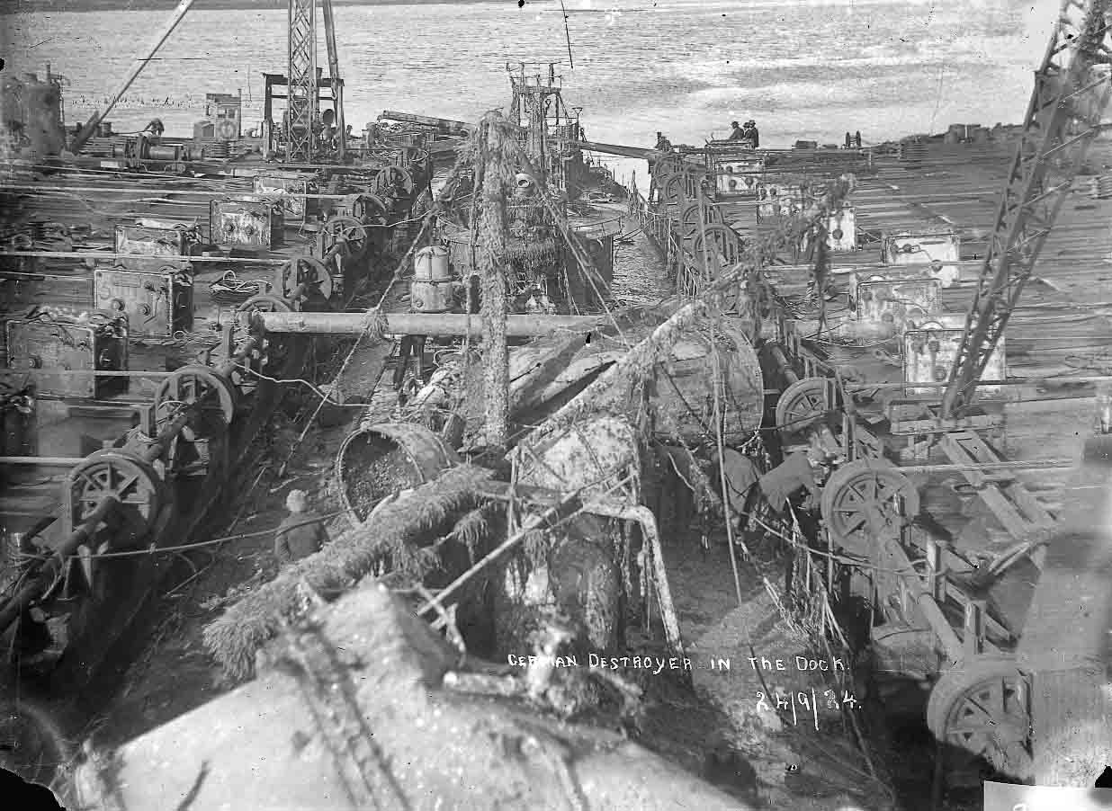 A German Destroyer in between the two halves of Cox & Danks Ltd's floating dock, used during their salvage operations in Scapa Flow, 1924.