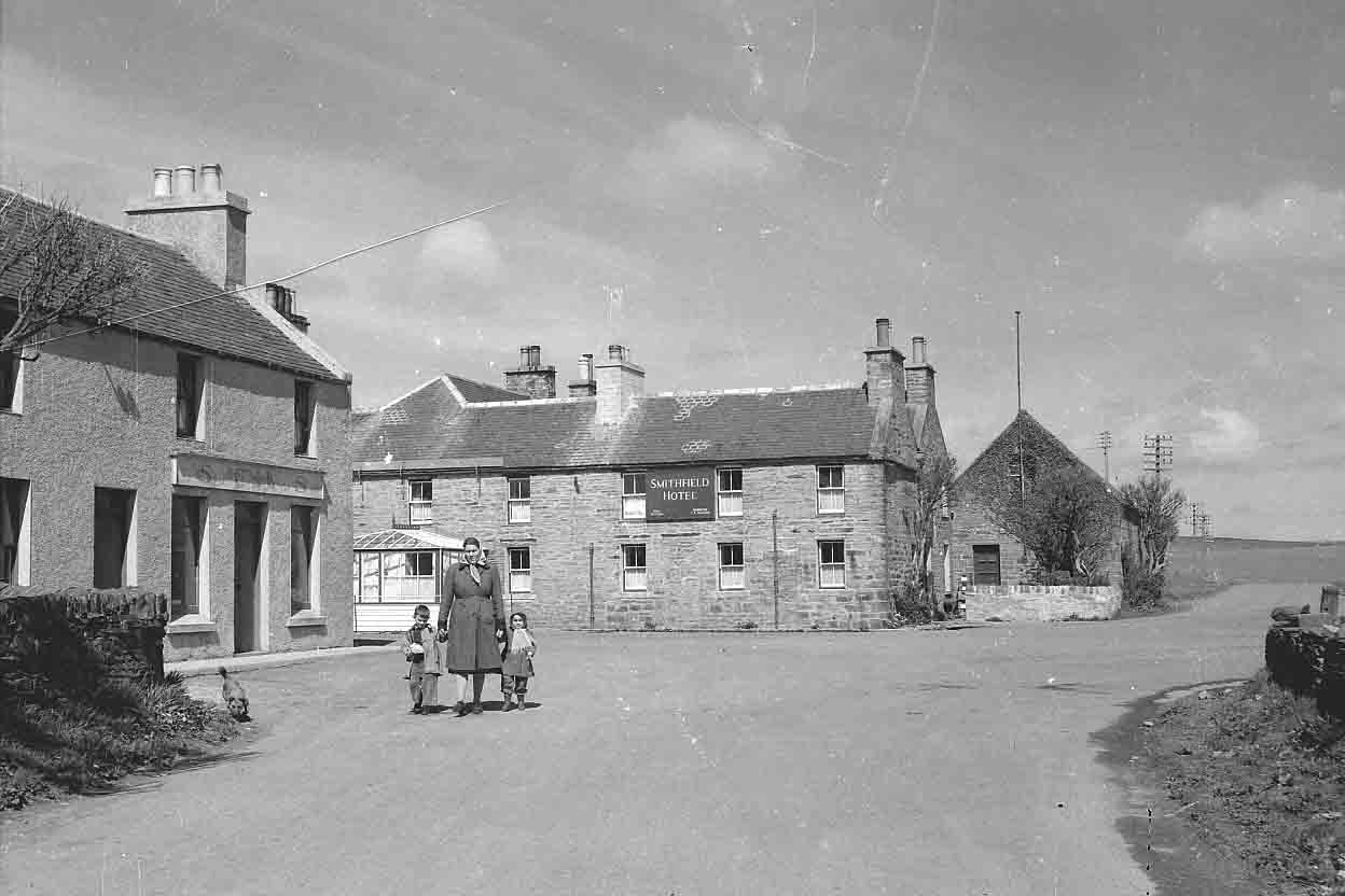 The crossroads at Dounby showing the Smithfield Hotel and the Scottish Co-operative shop, date unknown.