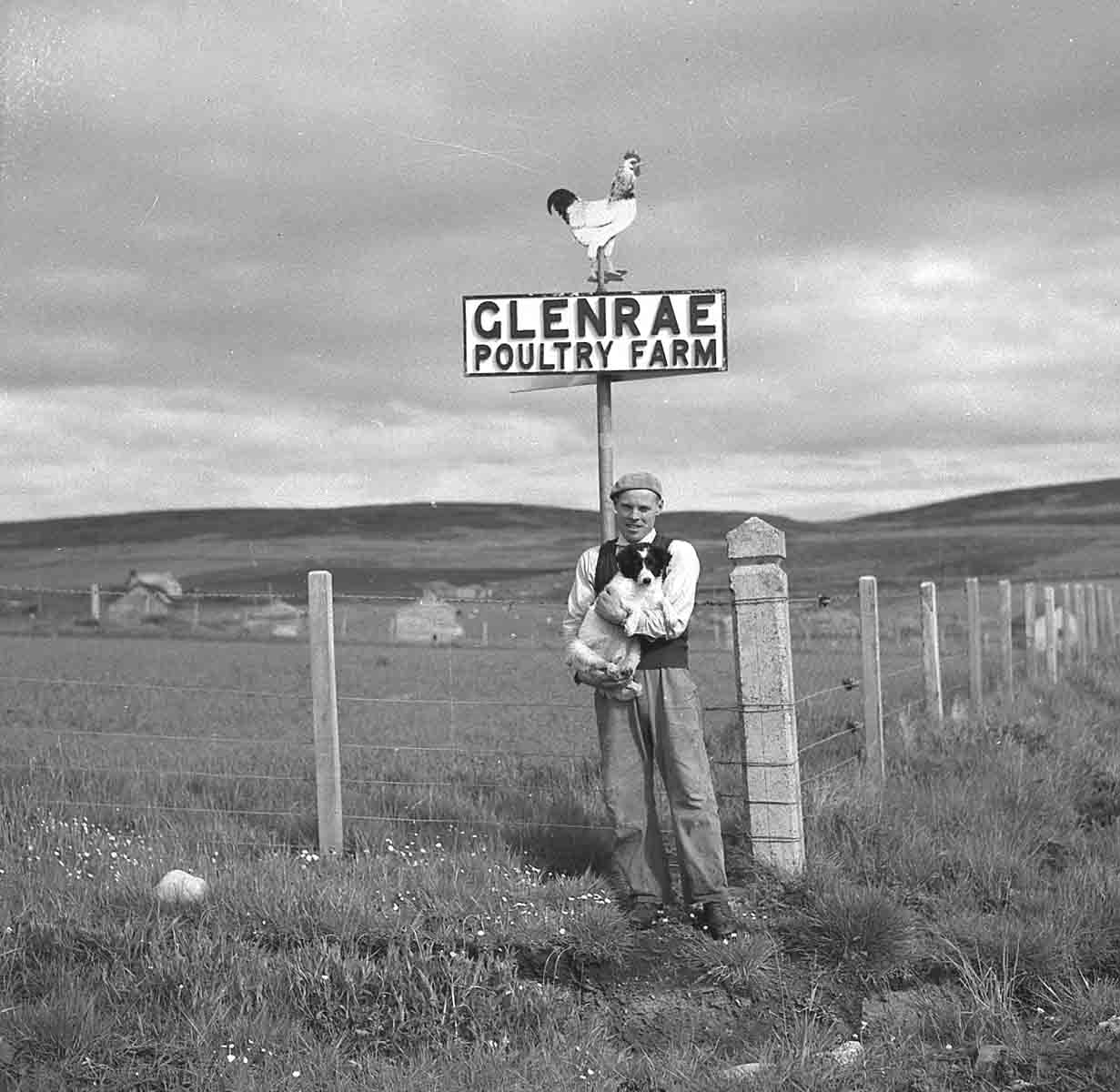 Joseph Groat of Glenrae Poultry Farm, Orphir, with snowy the dog, 1964. See Orcadian 25/6/1964.