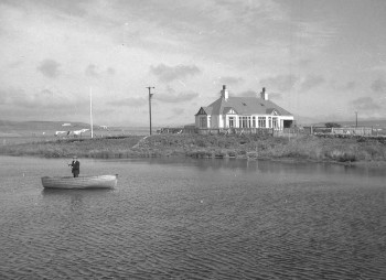 A fisherman in Harray Loch with Odin House, Stenness, behind. Date unknown.