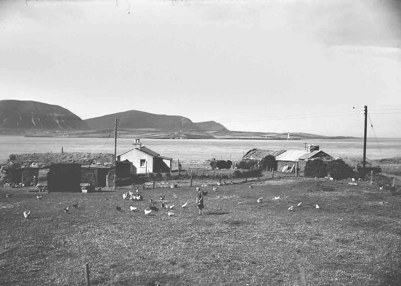 Feeding the hens in Orphir, with Hoy and Graemsay in the background. Date unknown.