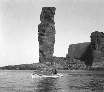 A motor launch sailing past the Old Man of Hoy, date unknown.