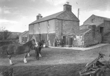 Mr Slater and Clydesdale horses at Yarpha, Orphir, 1959.