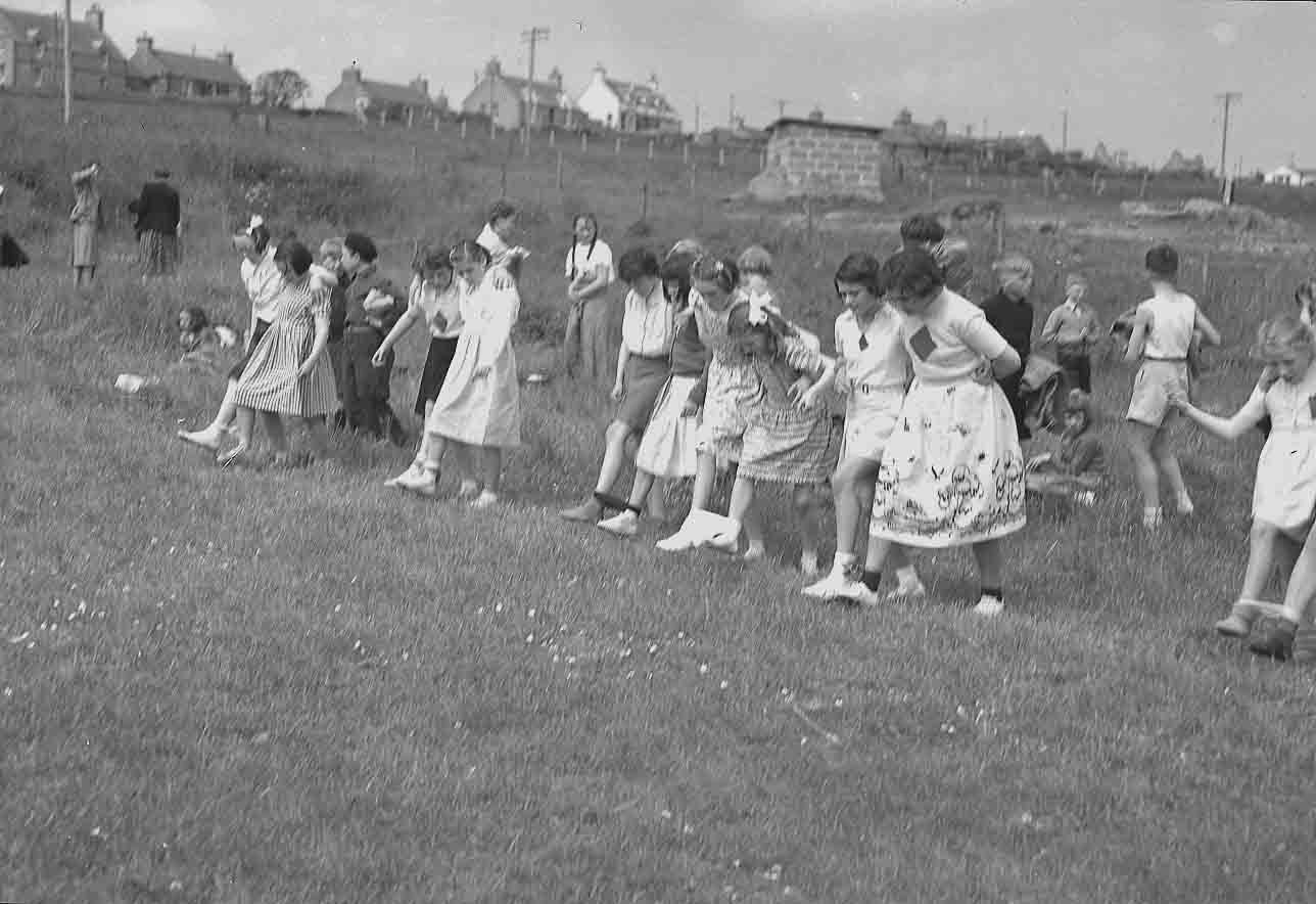 The three legged race, Stromness Academy sports day, on the Market Green, Stromness. Date unknown.