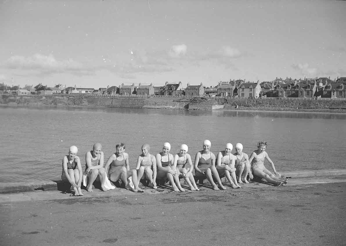 Swimmers on Kirkwall Pier, 1958. See Orcadian 25/9/1958, page 5.
