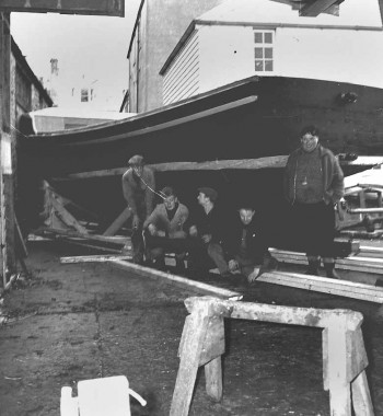 The Mayflower at Anderson's Boatyard, Stromness, date unknown. L-R: James Anderson, Brian Moar, Leslie Brass, Stanley Flett and Alan Pirie.