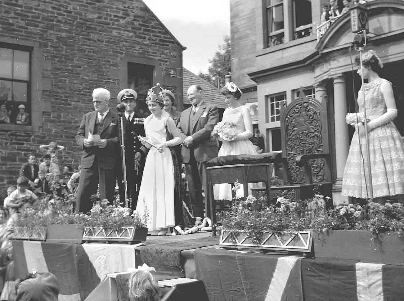 Stromness Shopping Week Queen, 1959, Aileen Fiddler with her attendants, Katherine Hill (Left) and Catherine Grieve (right).