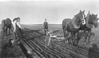 Copy negative showing a ploughing match at the Bu', Burray, c. 1908: Left: Gilbert Laird of Quoy; Right: John Wylie.