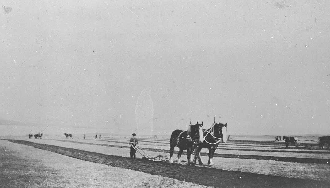 Copy negative showing a ploughing match at Bu', Burray, c.1928. On the left is Gilbert Laird of Quoy and on the right is John Wylie.