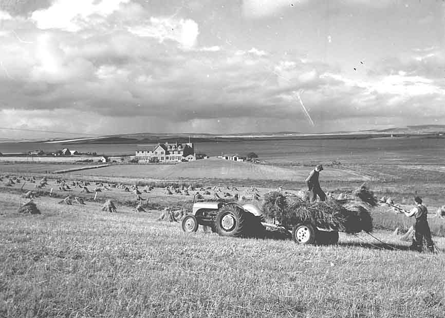 The Kemps of Little Barnhouse, Stenness, gathering in the sheaves, date unknown. The Standing Stones Hotel and Stenness Loch can be seen in the background.