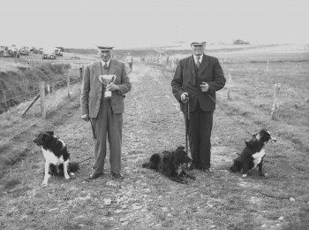 Stromness Agricultural Society Sheepdog Trials, held at Burnside, 6/9/1955. On the left is T. Cooper from Holm with his dog, Tyne, winners of the open class and cups for the best performance and best outrun and lift. See Orcadian 15/9/1955, page 5.