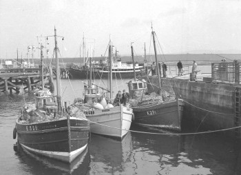 Part of the new Stromness fishing fleet, 1960, with the steamer 'Hoy Head' in the background: L-R: 'Learig', owned by A. Sinclair; 'Amaranth', owned by Alan Pirie; 'Venus', owned by Andrew Sinclair. See Orcadian 12/5/1960, page 3.