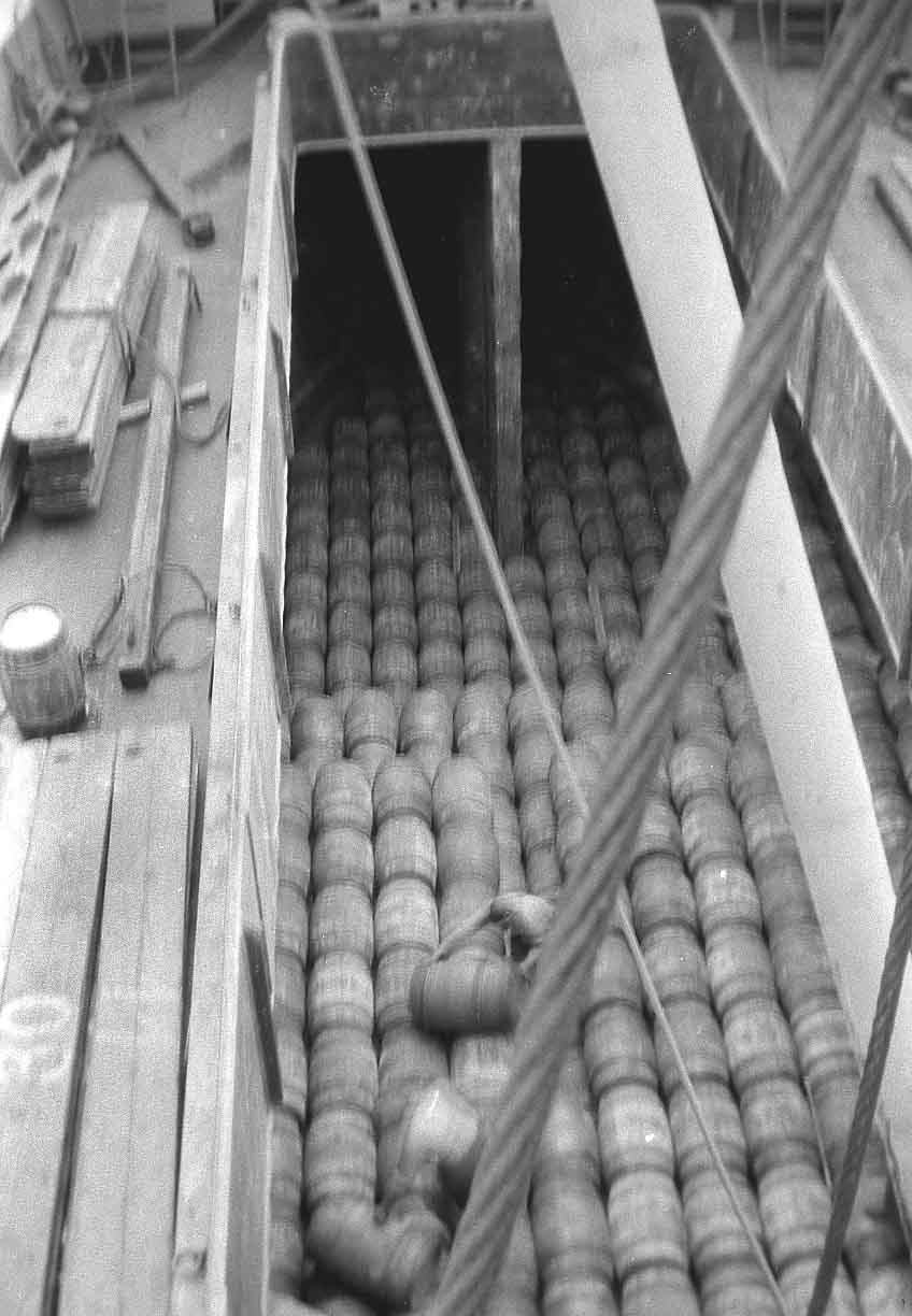 A ship being loaded with herring barrels at Papa Stronsay, c. 1938.