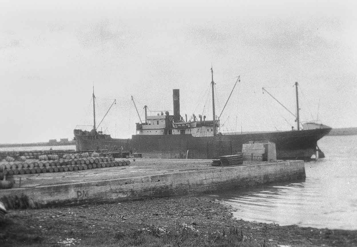 S.S. Dalalfven loading herring barrels at Sinclair & Buchan's pier, Papa Stronsay, c.1938.