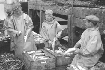 Gutting fish on board a fishing boat at Stromness pier, date unknown.