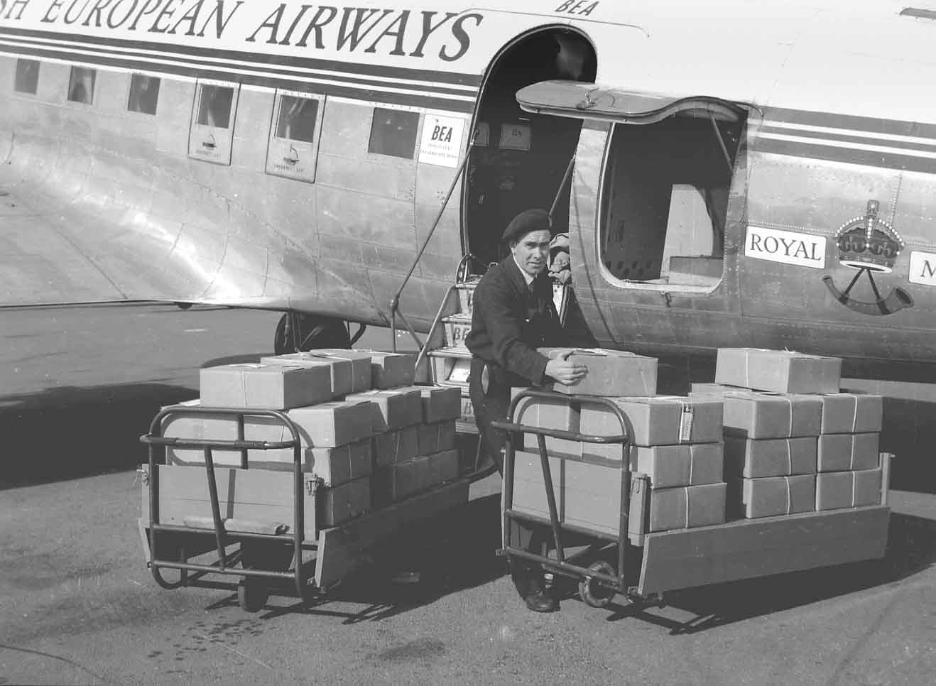 Loading 3 tons of lobsters on to a British European Airways plane at Kirkwall Airport. They were transported directly to France, 1959. See Orcadian 29/10/1959, page 5.