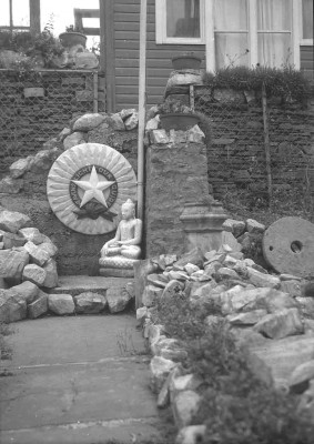 A view of part of the garden at photographer W.H. Hourston's studio, Stromness. Date unknown. The Buddha was reputedly brought home to Stromness by a sea captain in the mid 1800s. It was left neglected on Clouston's Pier for many years before being rescued by Willie Hourston.