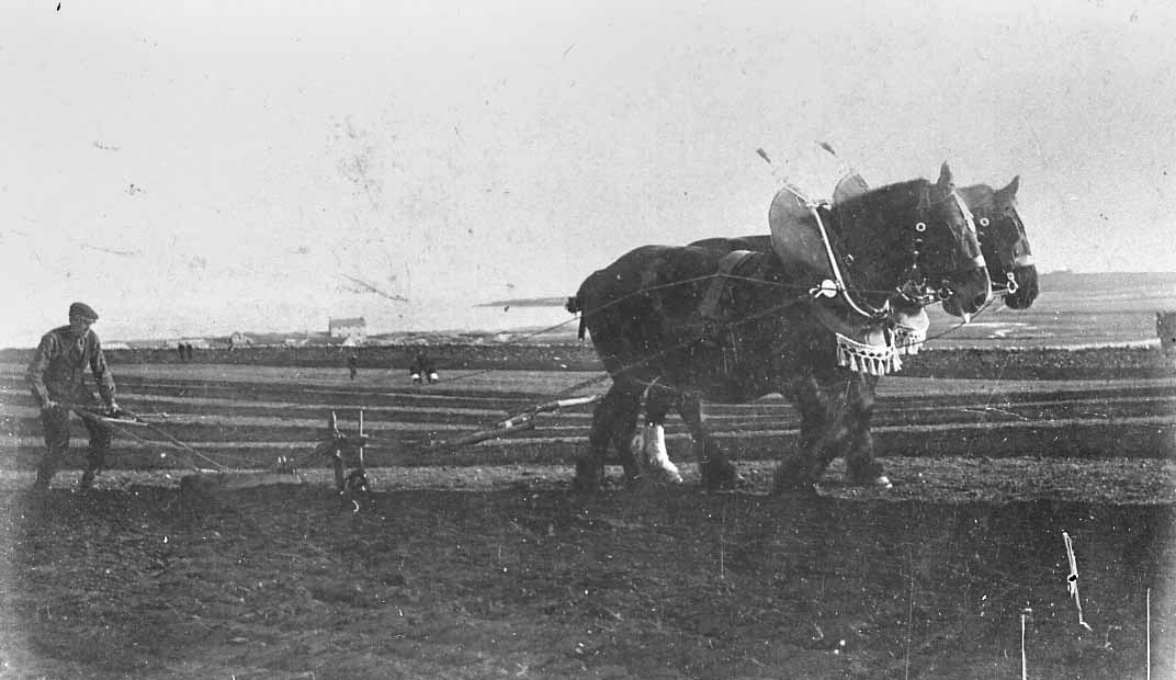 Copy negative showing George Kennedy of the Bu', Burray taking part in a ploughing match on his farm, c.1908.