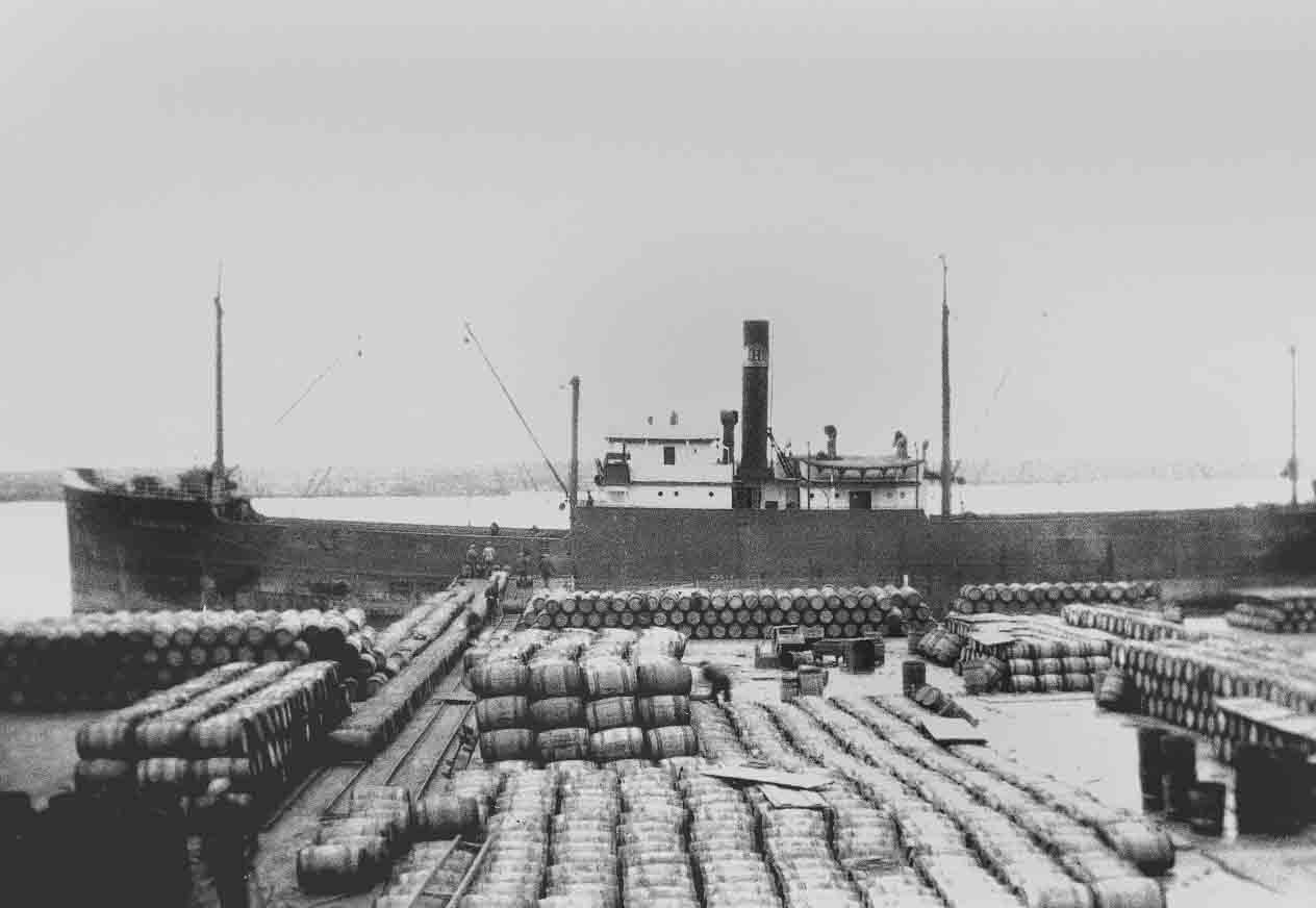 S.S. Dalalfven loading herring barrels at Sinclair & Buchan's pier, Papa Stronsay, c.1938.