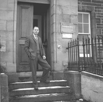 Mr D.J. Davidson, appointed as Town Clerk and Chamberlain of Stromness, February 1964. Photographed outside the Stromness Town House.