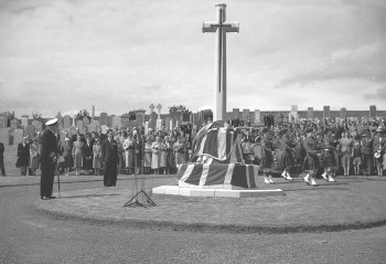 Unveiling the Cross of Sacrifice for men who lost their lives in or near Orkney during the two World Wars, in St. Olaf'sl cemetary, Orquil, St. Ola, 3/6/1956. The ceremony was performed by Rear Admiral Peter Skelton, standing on the left.