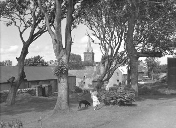 Trees at Buttquoy Park, Kirkwall, with Buttquoy Crescent and St. Magnus Cathedral in the background, c.1953.