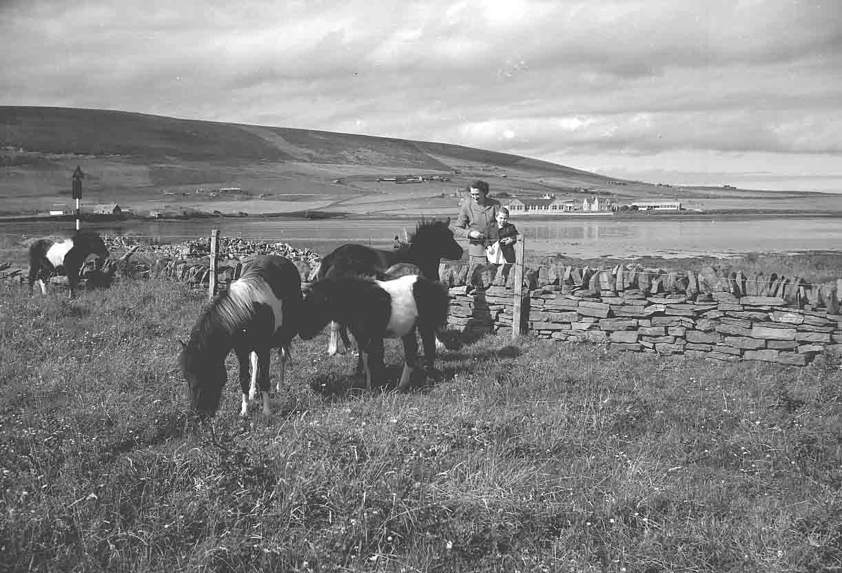 Shetland ponies near Finstown, Firth, with Firth School in the background, c.1950s.