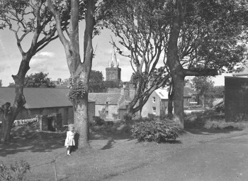 Trees at Buttquoy Park, Kirkwall, with Buttquoy Crescent and St. Magnus Cathedral in the background, c.1953.