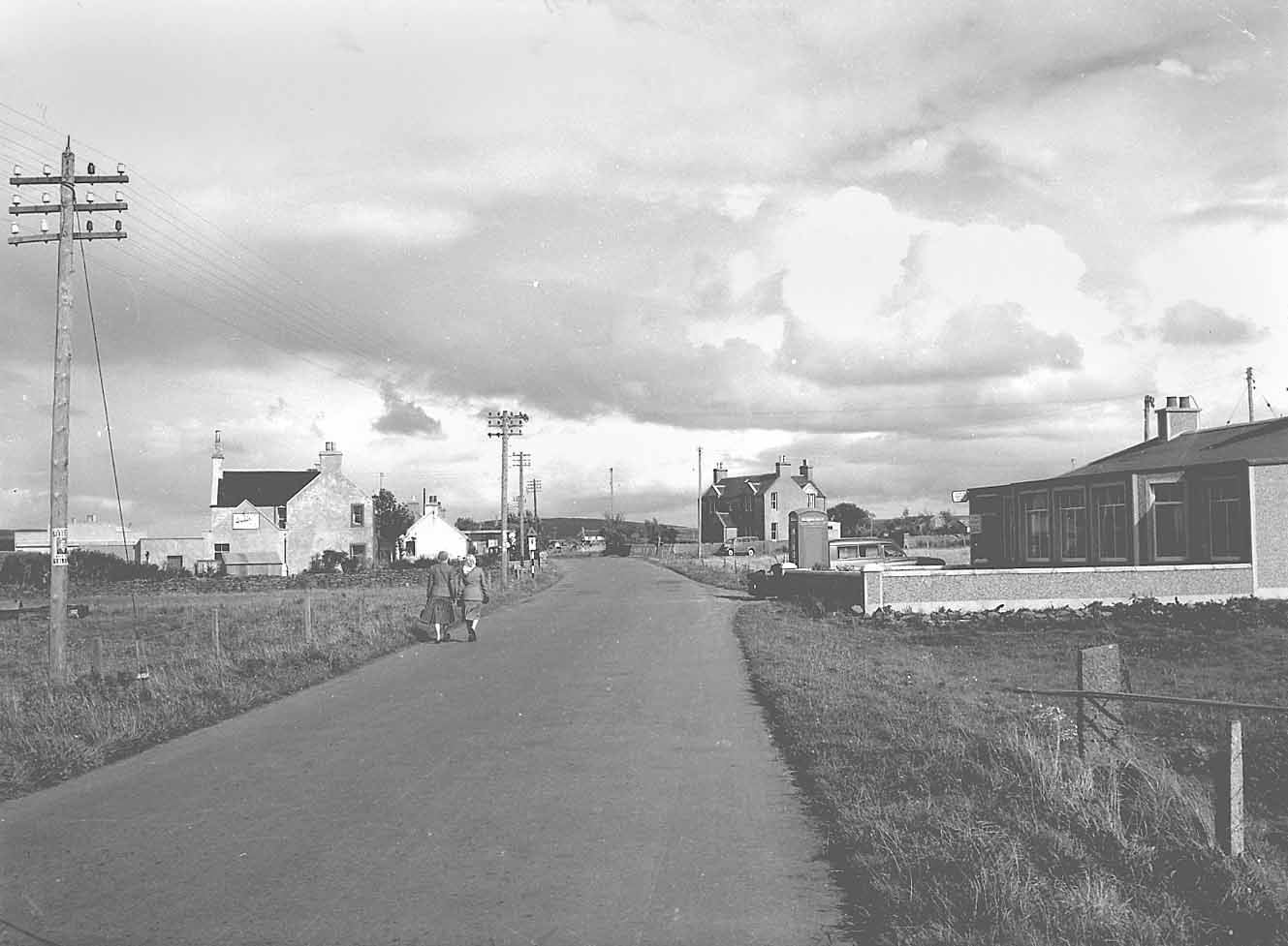 On the main road through the village, Stenness, c.1950s. The POst Office is on the right and the old schoolhouse is in the centre.