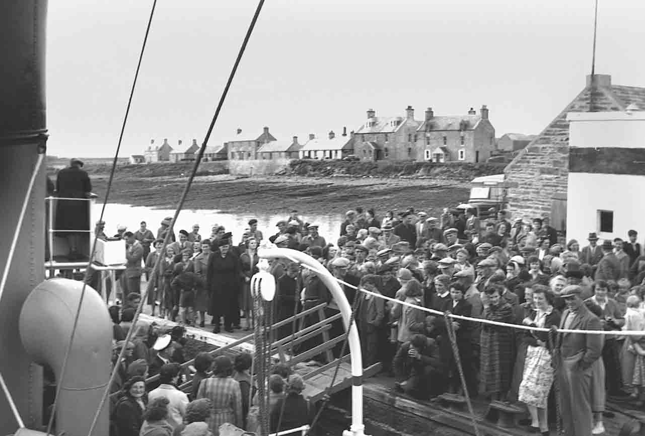A crowded Gill Pier, Westray, on a trip day, c.1950s.