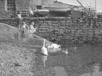 Children and swans, Flaws pier, Stromness, c.1960s. On the right is Elaine Linklater.