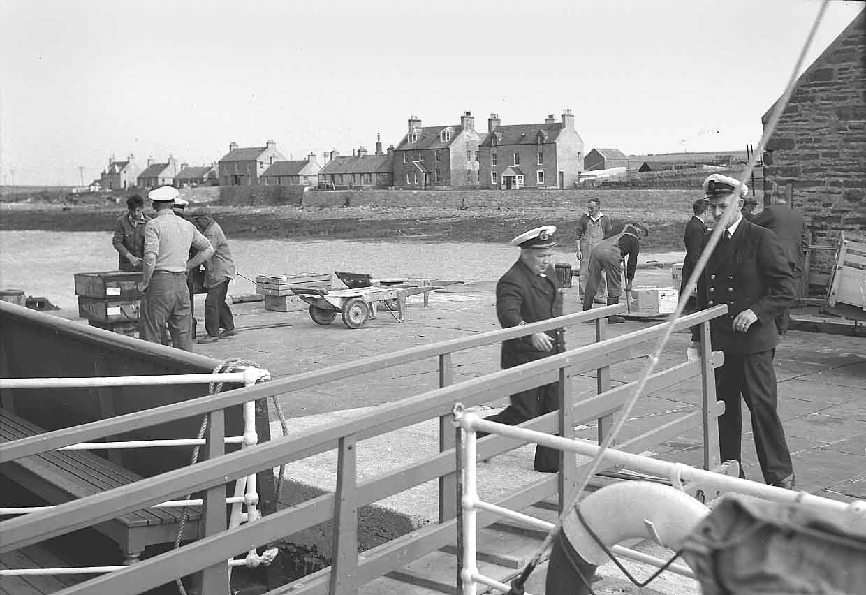 Captain Harcus (on the left of the gangway), of the M.V. Orcadia, boards the ship at Gill Pier, Westray. On the right of the gangway is Robbie Tulloch (aka Tifter), the Steward. c.1960s.