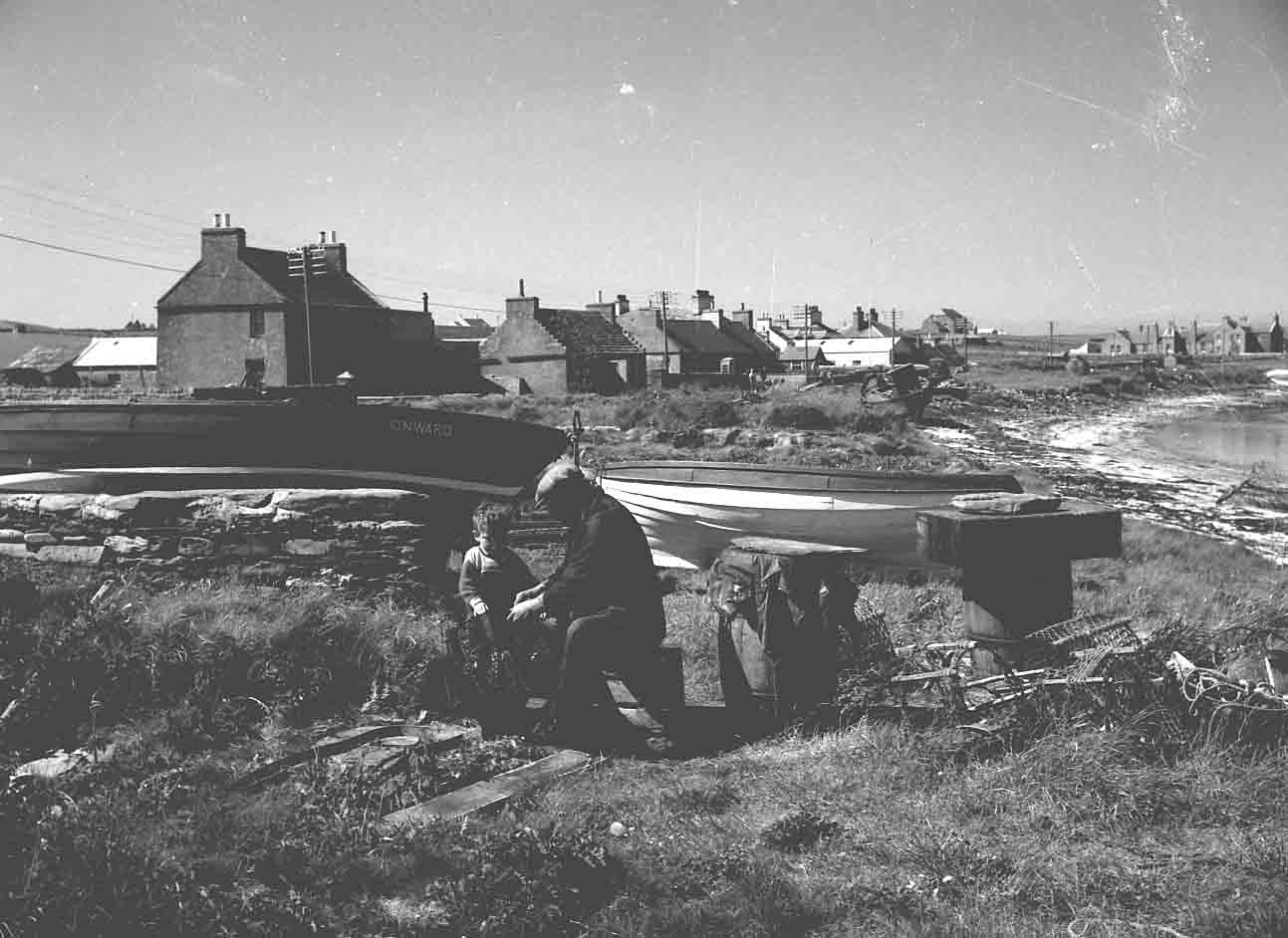 A young boy watching an old man mending a lobster creel, on the shore PIerowall village, Westray, c.1950s.