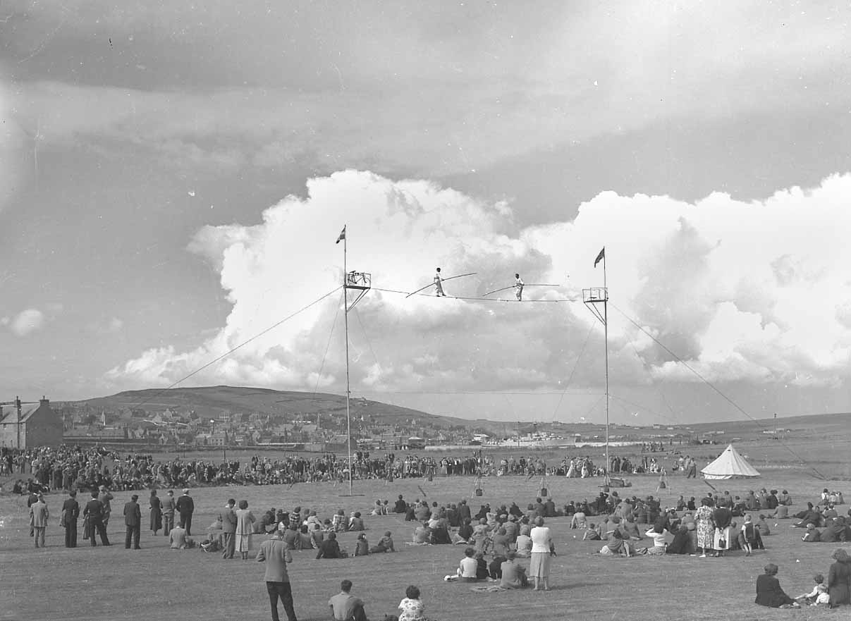 High Wire Act, 'The Two Waldix' at Stromness Shopping Week, 1953. See Orcadian 30/7/1953, page 5.