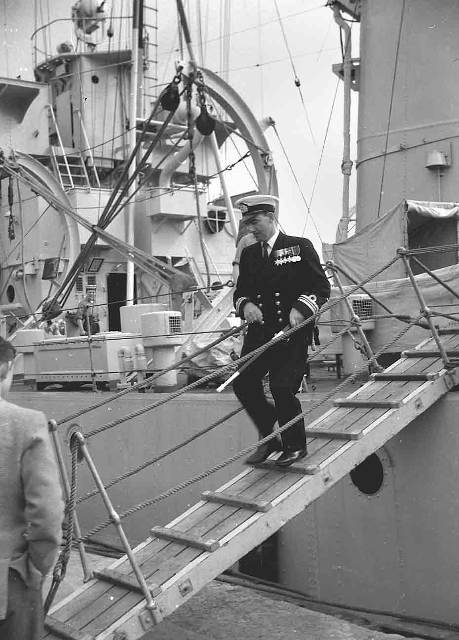 An officer leaving a Navy vessel, possibly at Stromness Pier, date unknown.