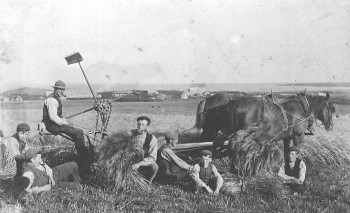 A horse drawn Back Delivery Reaper at harvest time, Burray, c.1908. The Bu' can be seen in the background.