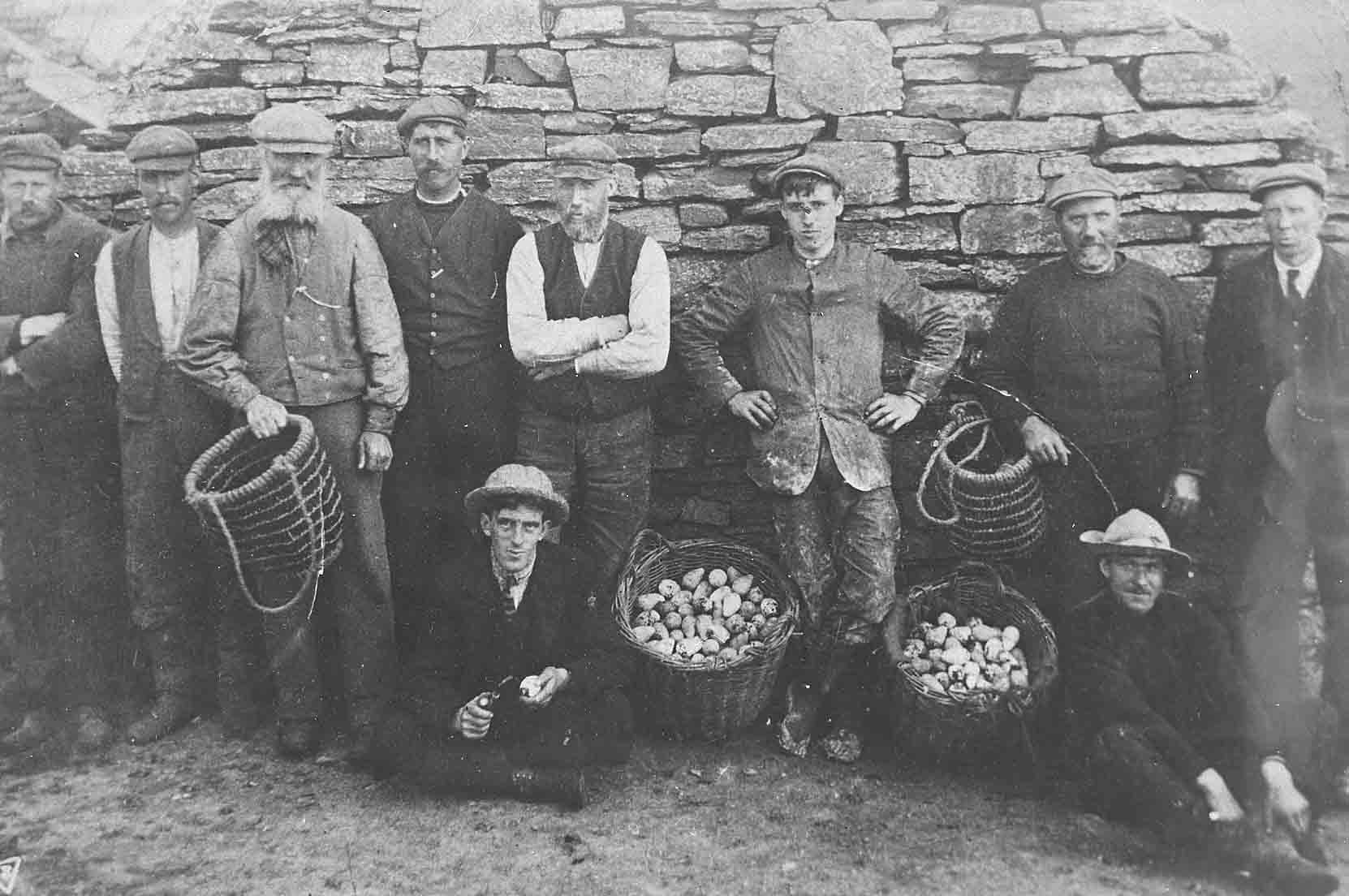 Copy negative showing men after collecting wild birds eggs from the Copinsay cliffs, date unknown.