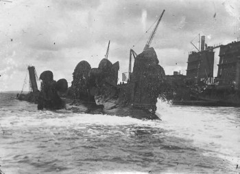 Copy negative showing salvage work on the German High Seas Fleet in Scapa Flow, date unknown.