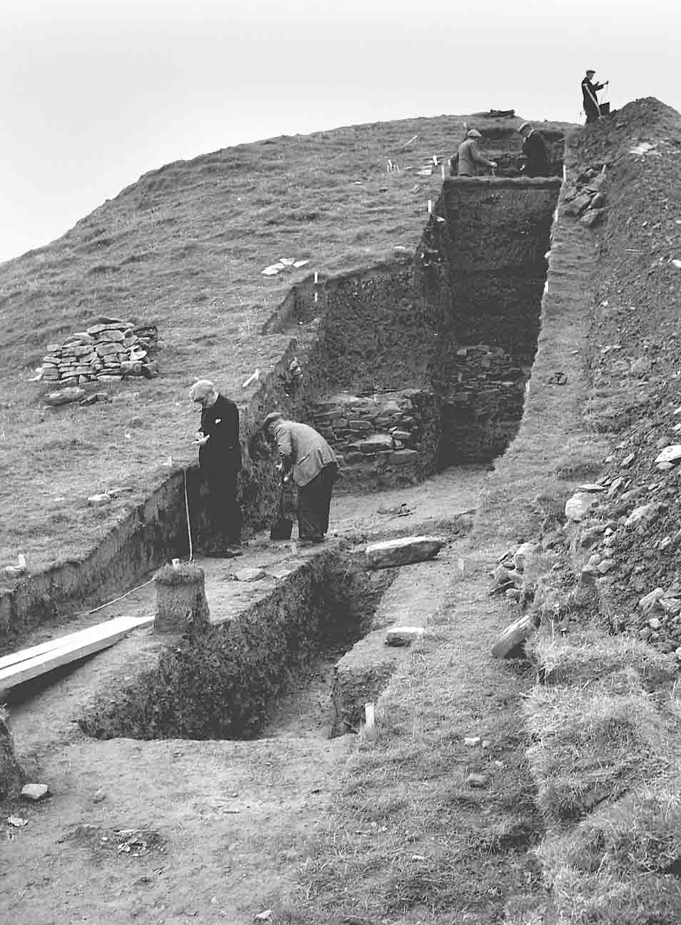 During July and August of 1954 Professor V. Gordon Childe supervised excavations of the South East face of Maeshowe chambered cairn, Stenness. The excavations took 3 weeks and a 6 feet wide incision was made. Professor Childe is taking notes on the left.