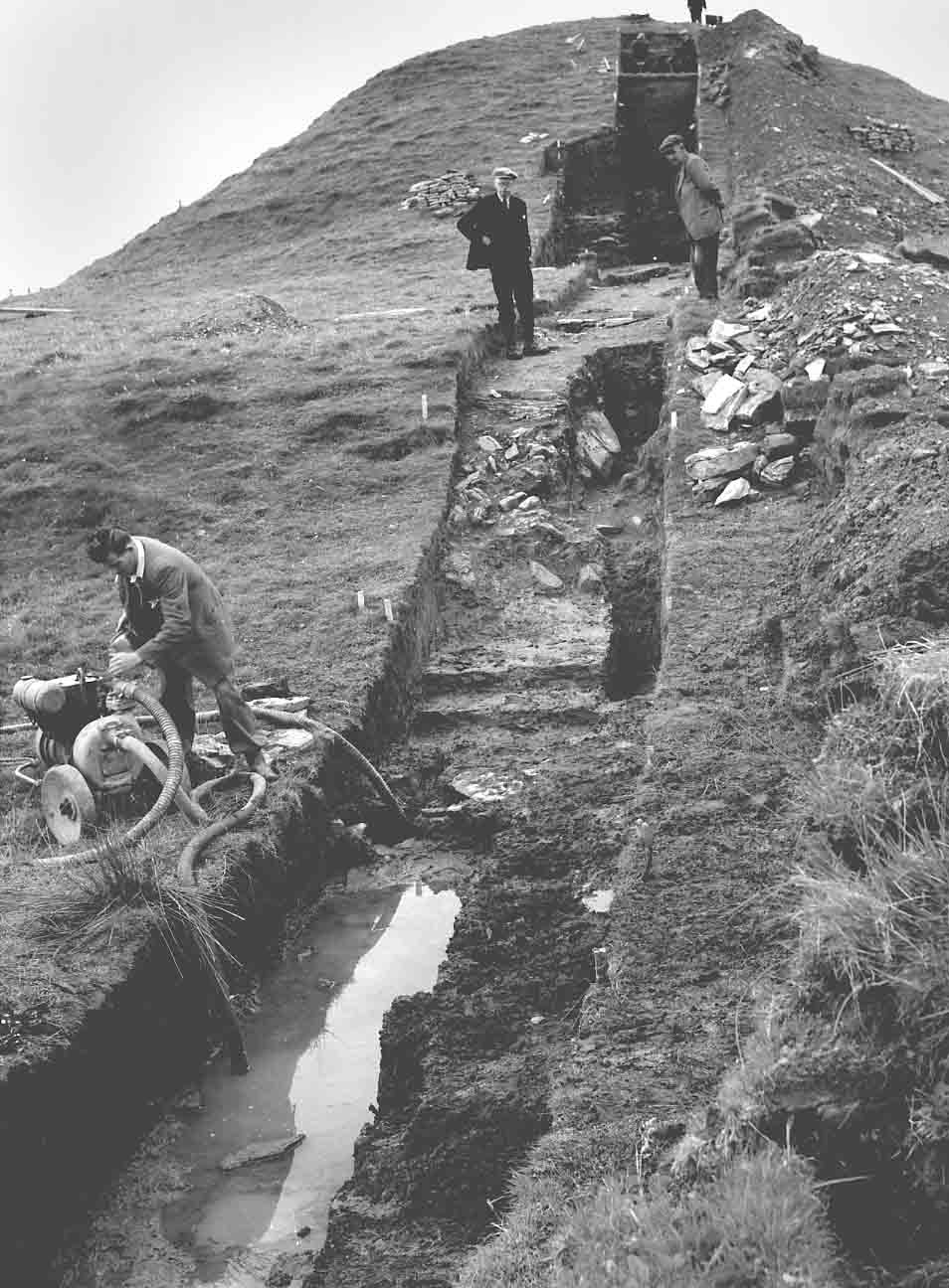 During July and August of 1954 Professor V. Gordon Childe supervised excavations of the South East face of Maeshowe chambered cairn, Stenness. The excavations took 3 weeks and a 6 feet wide incision was made. Professor Childe is standing in the centre, dressed in black.