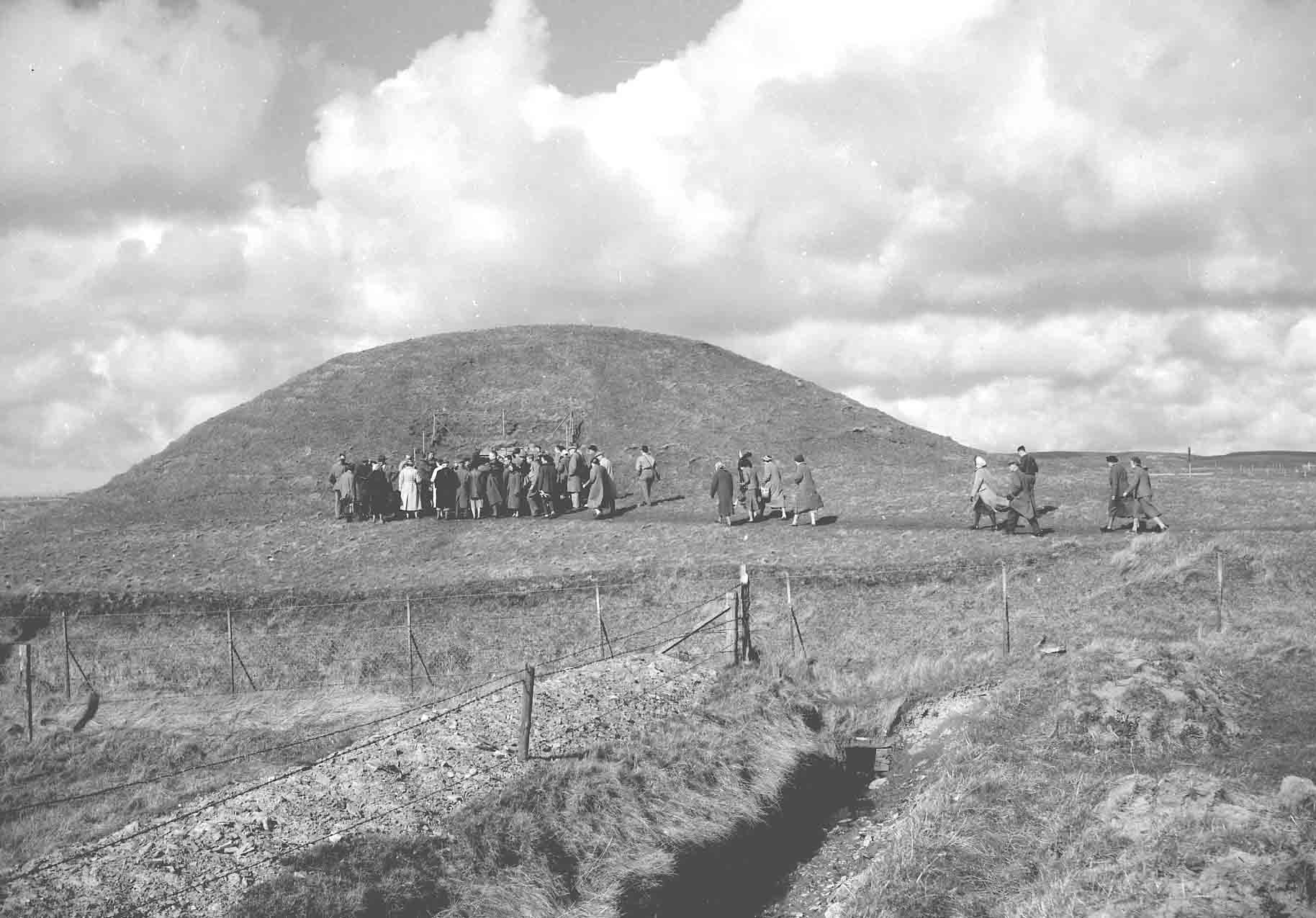 A group waiting to enter Maeshowe chambered cairn, Stenness, c.1950s.