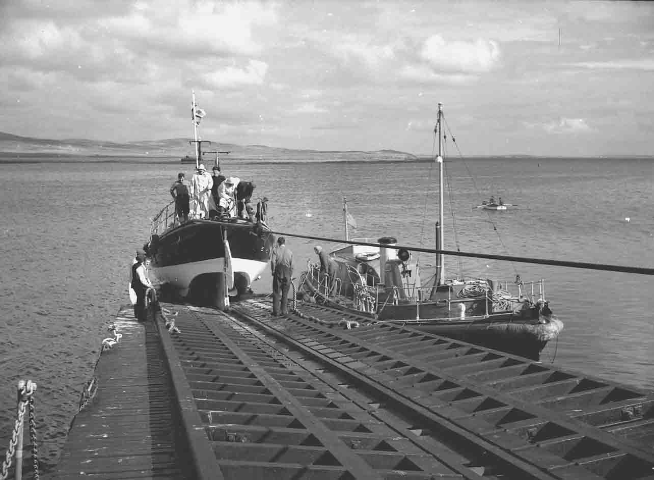 The new Stromness Lifeboat, NLB Archibald and Alexander M. Paterson, being pulled up the slip at the Lifeboat shed for the first, with the old boat, J.J.K.S.W. alongside. The new boat arrived on Saturday 21/5/1955. See Orcadian 26/5/1955, page 4.