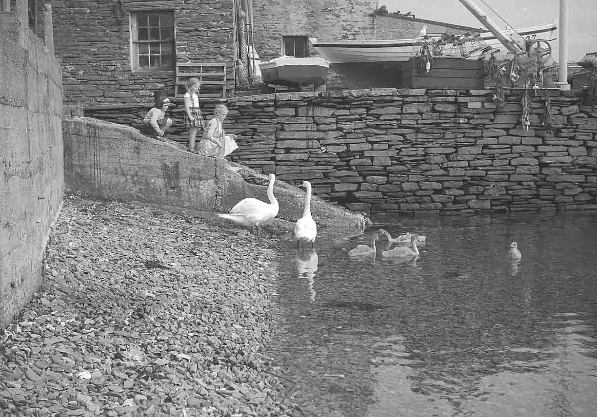 Children and swans, Flaws pier, Stromness, c.1960s. On the right is Elaine Linklater.