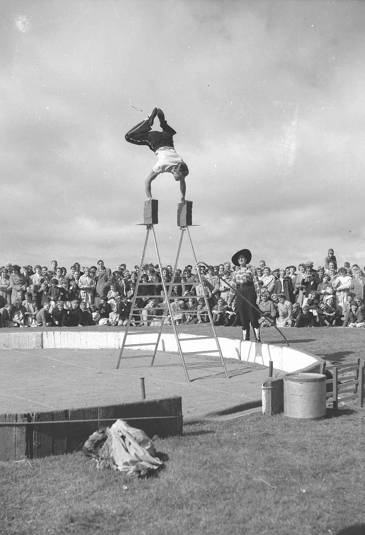 A balancing act entertains the crowd during Stromness Shopping Week, date unknown.