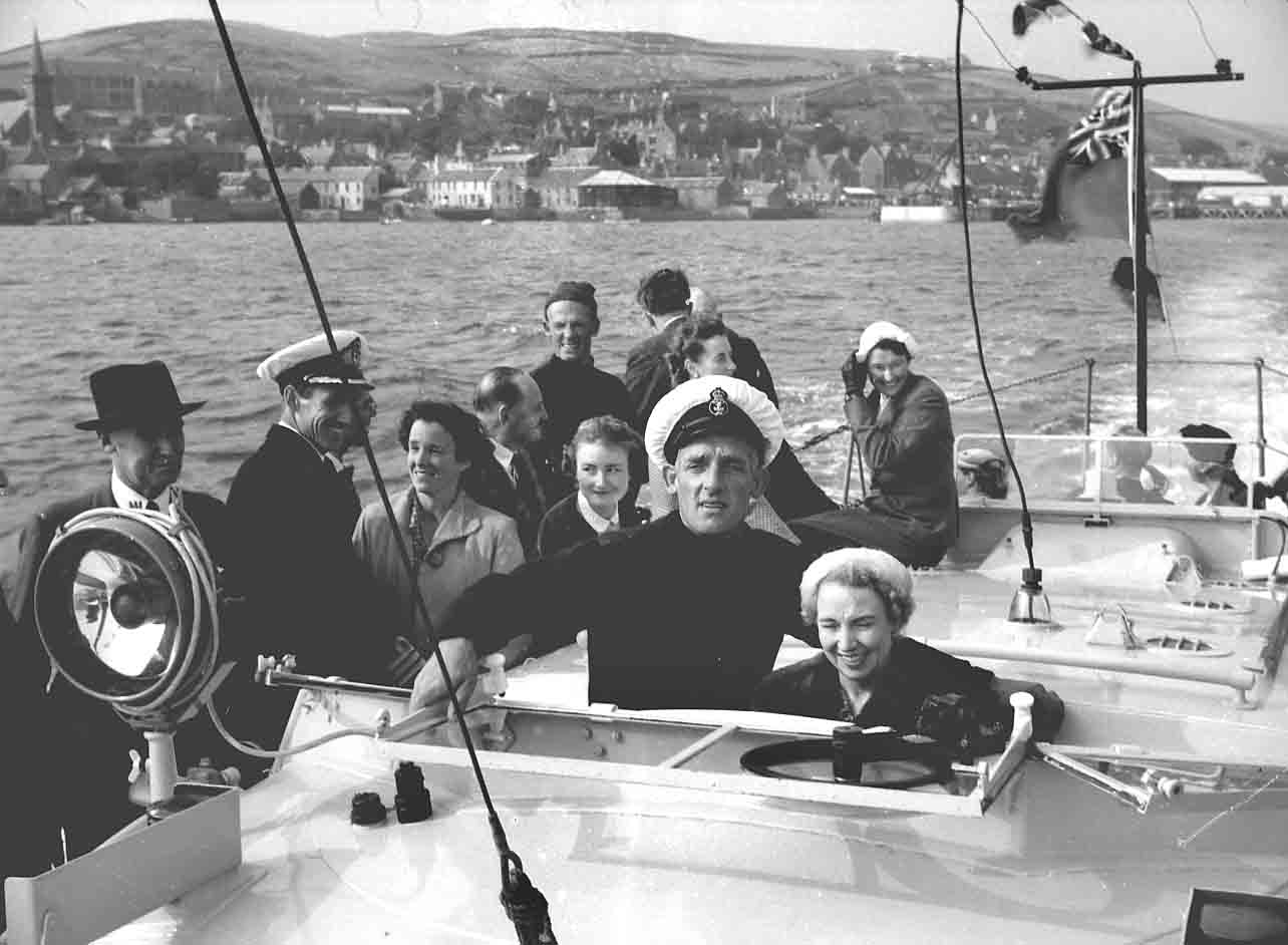 The naming ceremony for the Stromness Lifeboat, NLB Archibald and Alexander M. Paterson, on 25/8/1955. See Orcadian 1/9/1955, page 3. After the ceremony members of the platform party were taken for a trip around the bay. At the wheel are J. Adam, Coxswain, and Miss McKinnon from Glasgow. She was the cousin of the lifeboat donor and performed the naming ceremony.