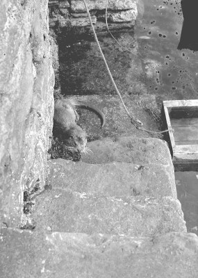 An otter playing in the water, Stromness, 1962. The otter had been rescued on Graemsay by the Lighthouse Keepers and taken to the Lighthouse Buildings in Stromness where it was reared by the Skinner family. See Orcadian 6/12/1962, page 3.