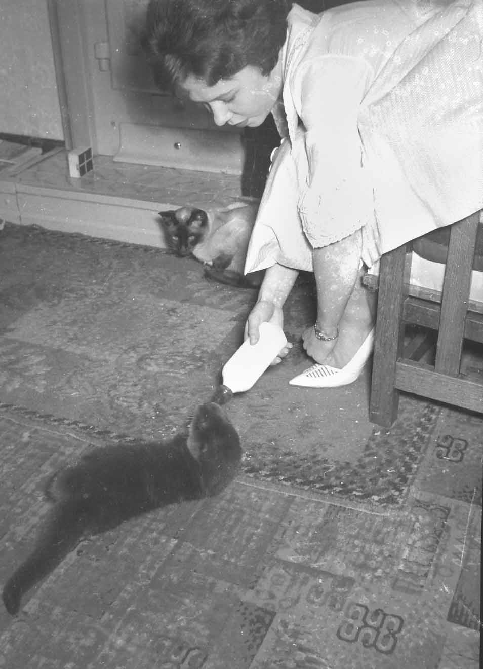 Maureen Skinner feeding an otter, 1962, watched by the family cat. The otter had been rescued on Graemsay by the Lighthouse Keepers and taken to the Lighthouse Buildings in Stromness where it was reared by the Skinner family. See Orcadian 6/12/1962, page 3.