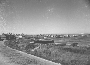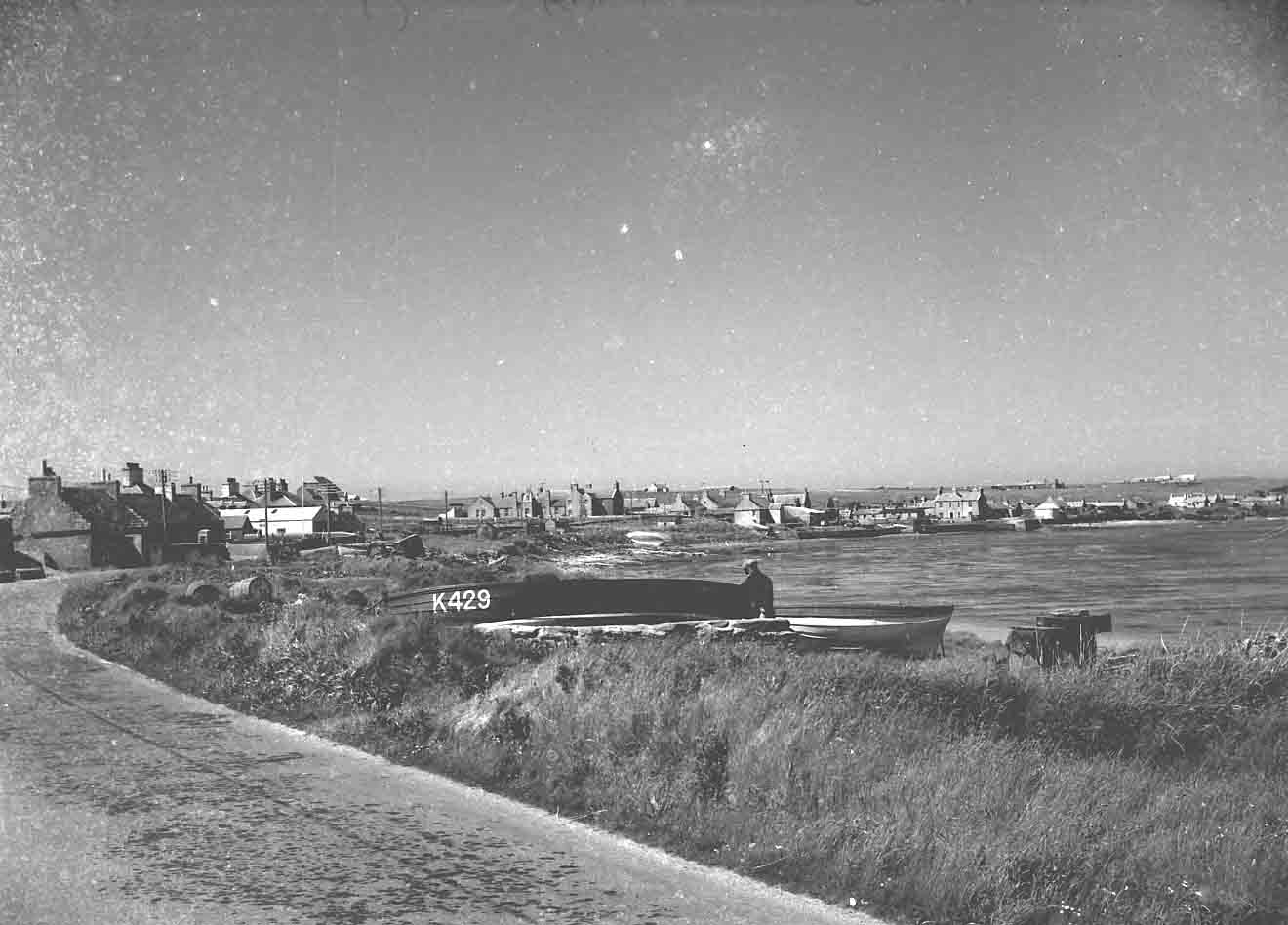 A man mending a boat on the shore, Pierowall village, Westray, c.1950s.